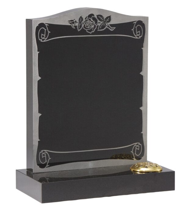 The WG30 Cemetery Memorial features a timeless design with a beautifully crafted sandblast scroll and rose ornament framing the inscription space. This elegant memorial creates a dignified tribute to honour your loved one’s memory.