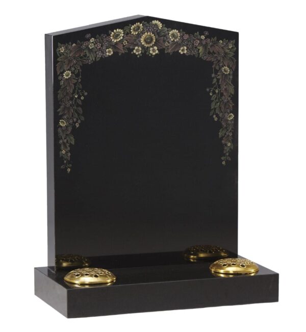 The WG45 Cemetery Memorial features a beautifully detailed border of painted wildflowers surrounding the headstone. Crafted with premium granite, this dignified memorial offers a touching tribute that celebrates life through nature’s vibrant beauty. Request a quote for this memorial, available in various colours.